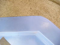 | 真冬のPキャン時に、どうしても床が底冷えするので、FFファンヒーターの吹き出し口を床にあてて暖めていた。 それが原因なのかは不明。 | 全部で11箇所のプッシュロック式の扉ノブの1箇所が取れてしまった事があったが、樹脂系の接着剤ですぐに直った。 開放ロック機能はないが不便はない。 | ミントが時々雑巾で拭いて掃除していたが、この撮影を機に本格的に汚れを落とす事とした。 市販の表面活性剤を使い効率良く掃除した。(写真は比較) 掃除後にキャビンが明るくなった。 |