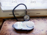 キャンピングカーの空気圧は安全面で非常に大切。 ツアー前は必ずエアチェックとエア補充は欠かさないようにしている。我家のJBはいつも3.5KPa(前)、5.0KPa(後)とし、ベンダー指定よりも0.5KPa多めに入れている。カーショップなどでは3KPa程度までのコンプレッサーしかなかったので、ホームセンターでトラック用のを購入した。(22KPaまで対応している。) 12V/24V対応でJBのサブに接続して使用している。電源のON/OFFのみの単純な仕組みなので使用には注意が必要。(パンクするまで空気を入れ続ける?)。 |