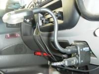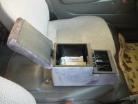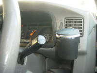 走行中のロックは、助手席か助手席下をお気に入りの場所としている。このライトはロックの夜間専用のダウンライトして利用している。またライト上部にはLEDによる3段階の電圧計もあるので、メインバッテリーの電圧チェックの目安にもなる。 標準の灰皿はロックがフロアにいる時には、使えないので運転席ドア側に専用の物を用意した。 |