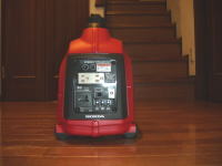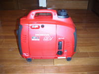 2002年末に登場したJB生活期待の大型搭載品。 これでサブバッテリーだのみだったJB生活が大きく変化していく可能性がある。定格出力は900VA(AC100)だが瞬間の負荷では1300VAまで踏ん張れるらしい。1000W以下の家電品なら大丈夫だし、外部電源入力ソケットから車内の100Vコンセントを使うのでブレーカーの関係でこれ以上の出力は必要ない。売りの正弦波はしっかりしており、マイコン制御ジャーやNotePCなどなんの問題もない。エコモードでは静かだが負荷がかかるとかん高い音で唸りだす。スーパーカブなどと同じ50ccの空冷4サイクルエンジンで稼動する。 |