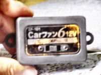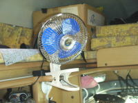 Carファン6(大自工業叶サ)をキャビンに設置。 ワニ口グリップでどこでも固定可能で12Vの電源ケーブルも3m近くあり設置場所の自由がきく。電源コードには弱/OFF/強の3段階スイッチがついているが、弱でもかなり強力でチトうるさい。 昔の扇風機みたいにモーター部に首振スイッチが付いており、60°の角度で首振りもする。暑い中のPキャンで扇風機として、またリヤクーラーの冷気拡散として効果がある。前々から欲しかったが、今夏たまたまディスカウンターで見つけて、\1,500で購入。 |