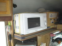高出力のインバーターが無いため、利用時は発電機を運転しなくてはならないという制約がありますが、連泊時はサブへの充電で連続運転しておく必要があり、あまり不便は感じない。 Eu9iで問題なく動くように出力500W(消費電力950W)のサムスンレンジ(KM-BP5J2)を探して購入した。 Eu9iのエコモードでも止まらずに出力を上げて動作するので、充電時も手間いらずで重宝する。 サムスンレンジは家電量販店で、\5.,000-前後で購入した。 周波数自動切換え機能が無いため、Eu9i側を50Hzに切り替える必要があった。 |