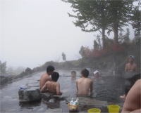 あいにくの雨で展望が望めず 馬曲(まぐせ)温泉には、 木島平スキー場に来た時に寄ったことがあったが、夜だったので自慢の展望があまり望めなかった。 今回も深い霧(雨)のため展望はお預けとなった(あ〜残念)。 源泉が43℃なのでどちらかというとぬるい感じだが、景色を眺めながら長湯するにはちょうどいいのかもしれない。 内風呂は露天よりやや高い温度だったような気がした。 入浴券を持っていれば何回でも入れるので、休憩所で食事をしたり、JBに戻って休んだりして長居することも可能なので、1日中ここで温泉三昧も楽しいかもしれない。 天気の良い日に再訪したい温泉である。 |