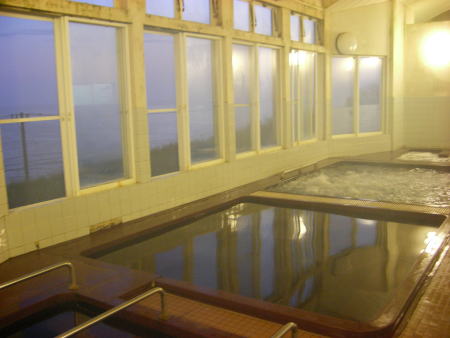 小泊村の駐在さんに教えてもらった温泉で、たまたま居合わせた雄乃湯温泉の親戚の人が、入浴後の車中泊の許可まで取ってくれたのでそのままP泊する事ができた。(感謝) 海に面しているのにお湯は、それほどショッパくなかった。お湯はぬるめで湯量もそれほどあるようには感じられなかった。 ここのロケーションからすると、日本海に沈む夕日を眺めながらの入浴が最高な感じ。 また食堂で飲食ができ、ラーメンは昔ながらのしょうゆ味で美味しく、もちろん生ビールは最高。 ![]() 女湯も男湯も開けっ広げ |