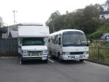| 番外 大滝の湯で見たキャンカー達 今回の連休で草津は相当混んだらしい。 ミントが外湯のよもやま話で仕入れてきた情報によると、”午前2:00過ぎでも「道の駅 草津運動茶屋公園」は満車で側道にまで車があふれていたらしい”とのことで、キャンカーに限らず一般車でのシーズン最後のP泊を楽しんだ人達が沢山いた模様。 そんな中で、大滝の湯駐車場で見かけたキャンカーを番外でご紹介。 大滝Pへは、かなり来ていますが、ここまでのキャンカーを見かけたのは今回がはじめてです。 (このほかにも沢山きていました) |
